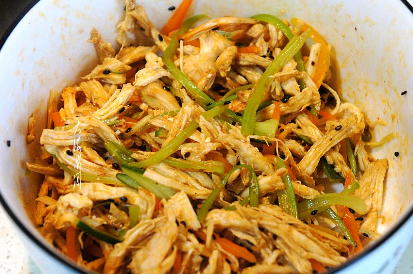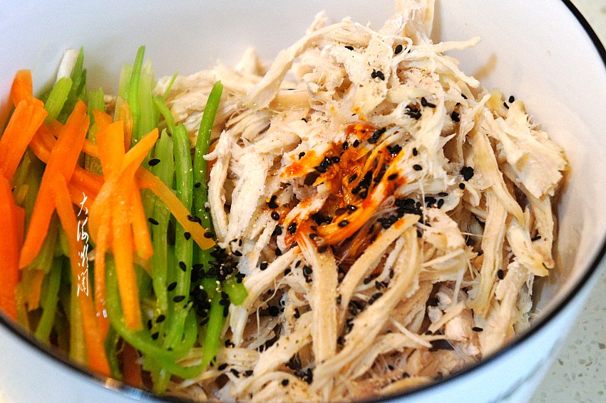 取大一点的容器,加入准备好的鸡肉丝、胡萝卜丝和芹菜丝,然后加入熟黑芝麻、白糖、六月鲜轻10轻盐原汁酱油、味达美清香米醋、蒜、辣椒油。