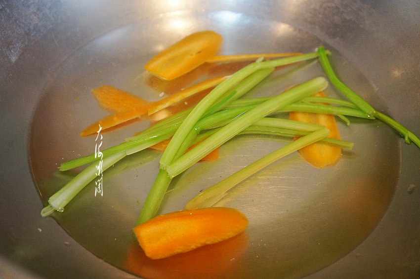 胡萝卜切片,锅中加入适量的水,少许加点盐,保持蔬菜的鲜艳。水开下入芹菜和胡萝卜片焯水,捞出过冷水,控净水分。