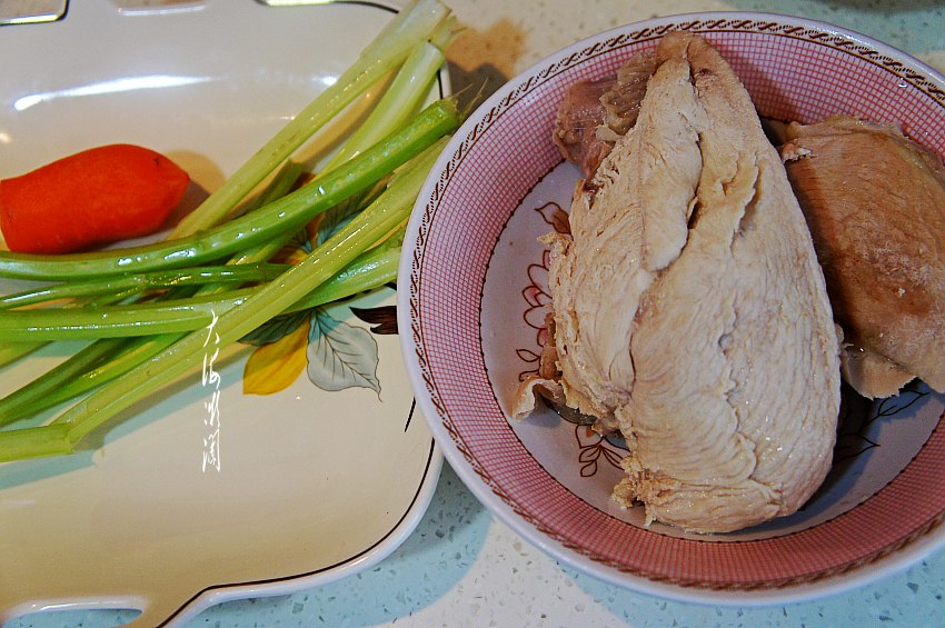 胡萝卜去皮洗净,芹菜摘洗干净。煮熟的鸡胸肉捞出晾凉,小朋友说这样吃就很香。