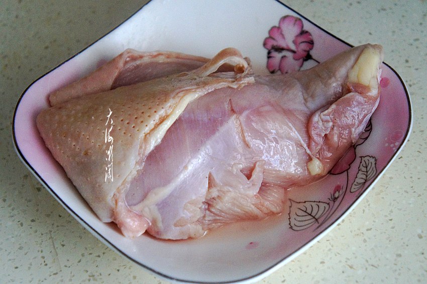 鸡胸肉冷水浸泡出血水,这块鸡胸肉是自家杀的老母鸡,很大很肥,一个鸡胸肉吃了两顿,这肉就是好吃,煮熟后嚼起来特别香。
