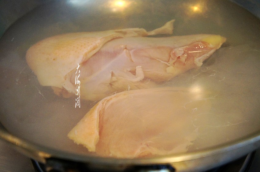 冷水下锅焯水后,加入花椒大料、葱姜和少许盐,把鸡胸肉煮熟。