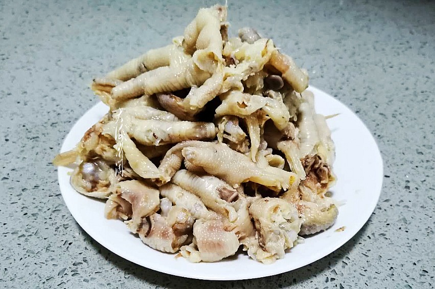 煮熟的鸡爪捞出放入冷水中泡5分钟左右,控净水分,放入冰箱冷冻半小时左右,方便去骨,口感还好。