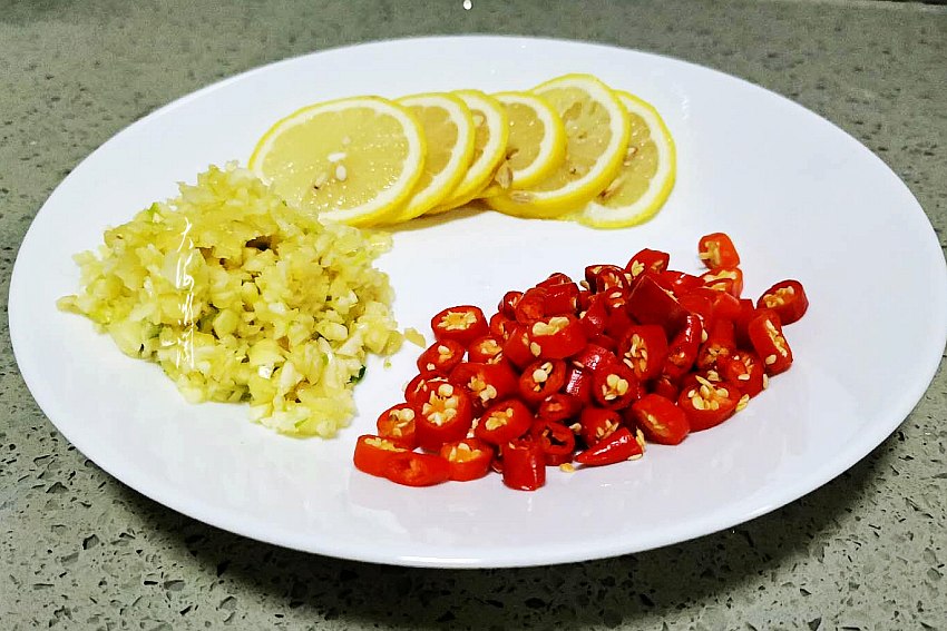 小米椒改刀切辣椒圈,蒜去皮洗净切碎,柠檬切片。