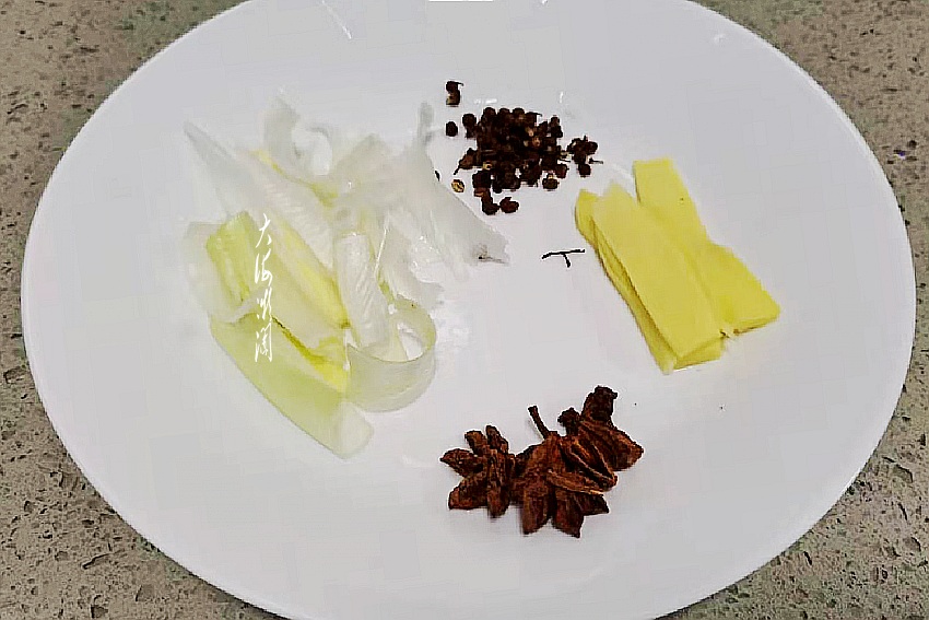 葱姜去皮洗净,切段切片,备点花椒大料。