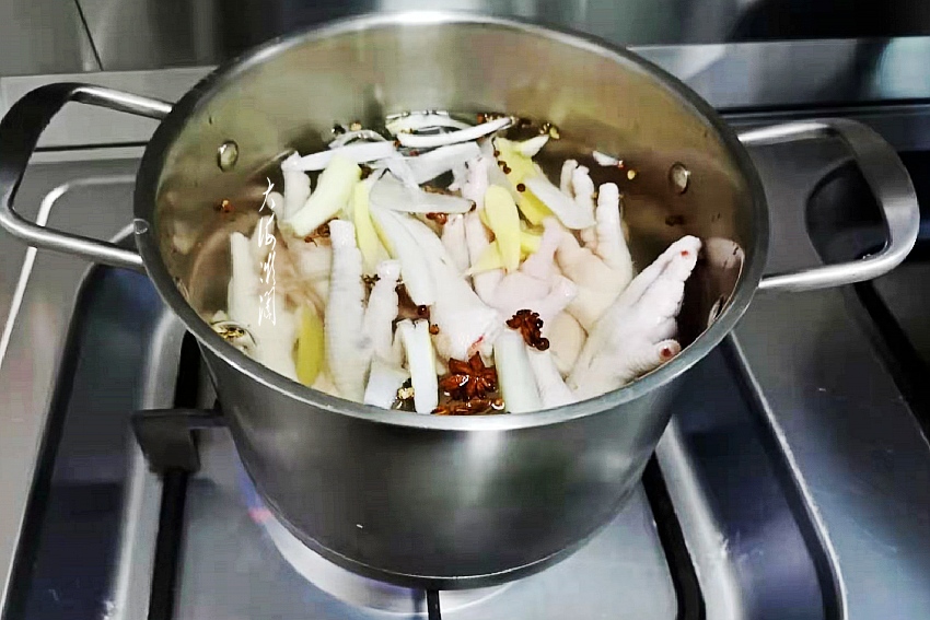 锅中加入适量的水,加入清洗干净的鸡爪,加入少许料酒、盐,下入葱姜和花椒大料,大火烧开,转小火煮半小时左右,煮烂一点好脱骨。