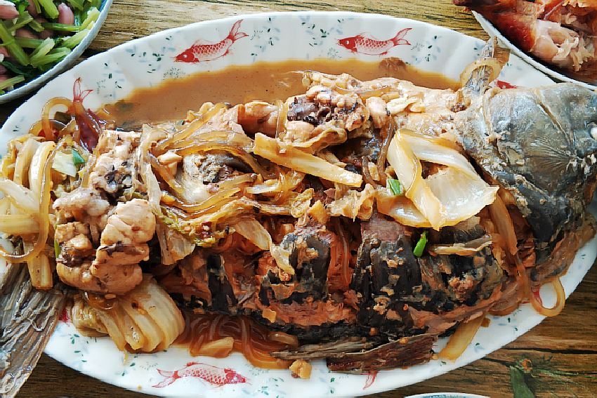 【酱炖鲤鱼】过年的餐桌上,鱼是不能少的,连年有余吗!小年也一样,各家有各家的做法,东北人喜欢用自家的黄豆酱炖鱼,真香,我也爱吃,味道纯正。这鱼炖得入味,非常鲜美,肉嫩,口感好,别看卖相,自家做就是实惠,这样一条大鱼在饭店怎么也要几十元吧,自家做也就十几元。平时多吃鱼,有利于健脑,强筋壮骨。