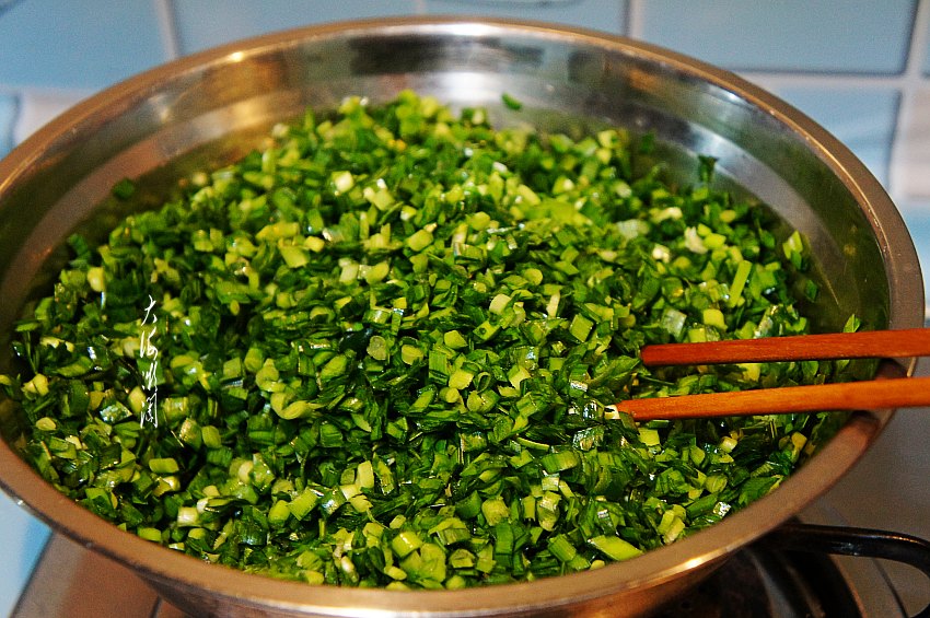 准备饺子馅:韭菜去掉杂质,在淡盐水中浸泡10分钟以上,然后反复清洗干净,控净水分后切碎,然后拌上点花生油锁住水分,花生油拌馅还是挺香的,没有花生油用色拉油即可。