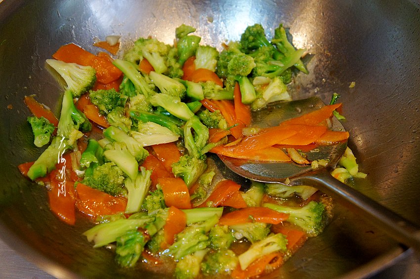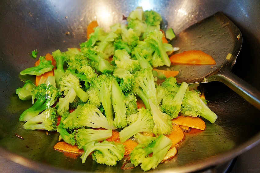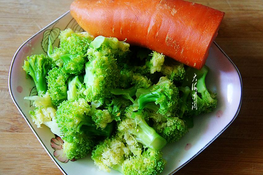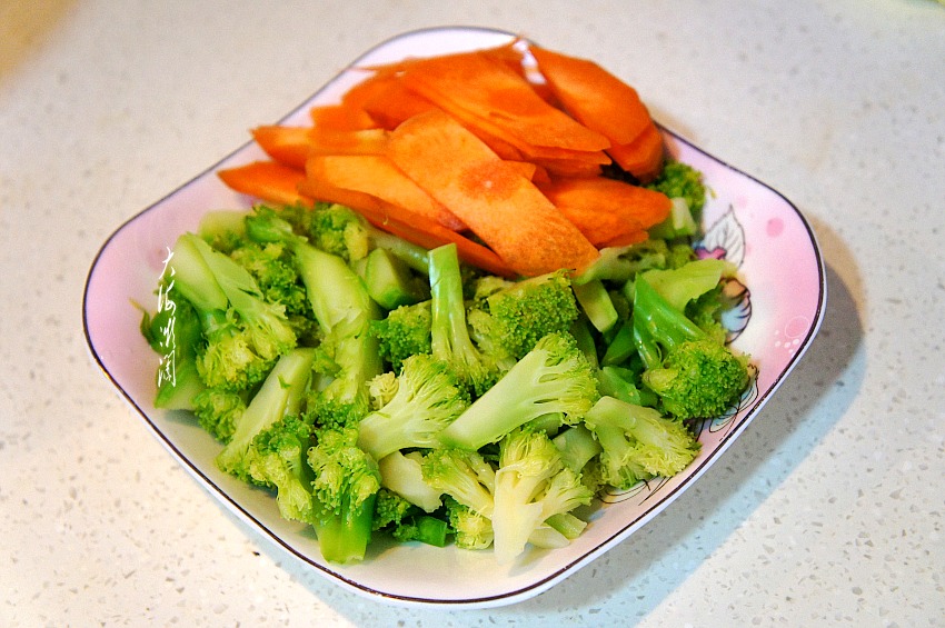 少许淋点水,西兰花和胡萝卜的颜色更漂亮,口感更脆嫩。加少许盐、少许轻盐酱油调味。