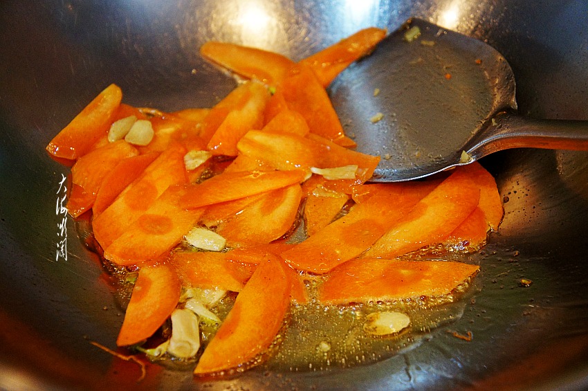 炒锅加入适量的油,爆香葱蒜,加入胡萝卜翻炒。胡萝卜中的β-胡萝卜素是一种脂溶性维生素,油炒,或是搭配荤菜炒能让人有效利用这些胡萝卜素,提高机体免疫力,当然也不要太油腻,正常炒菜先炒胡萝卜就好。