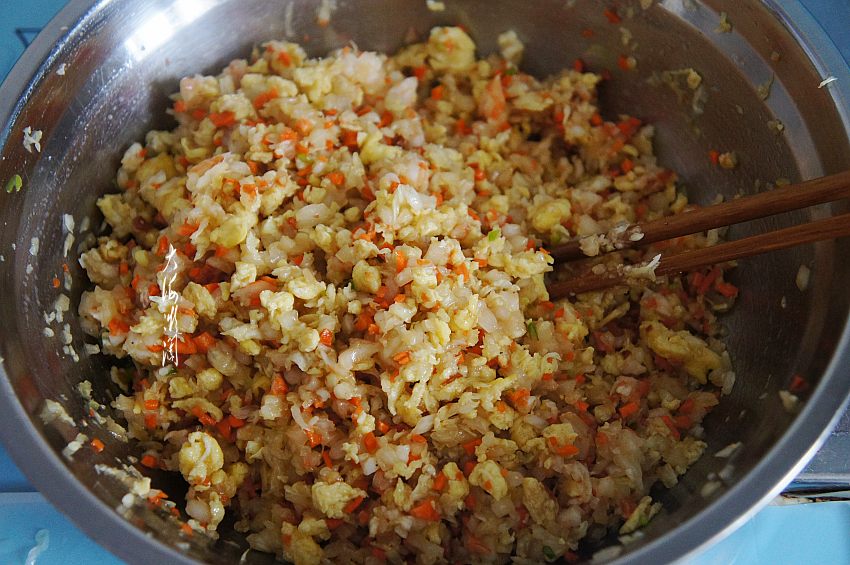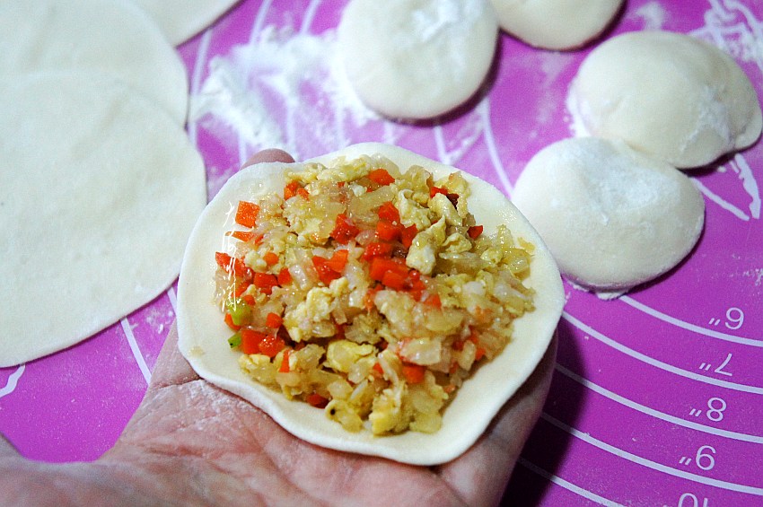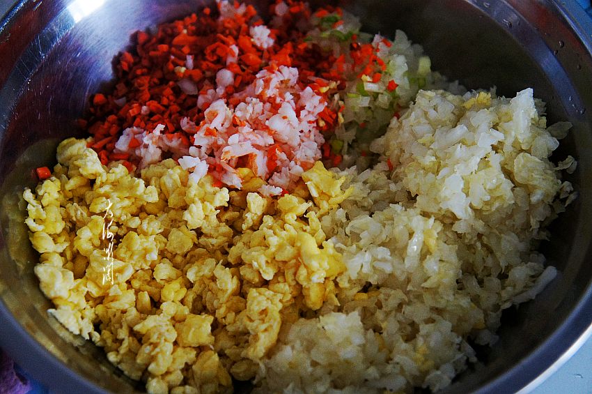 2、合子馅,白菜鸡蛋馅多放点葱,很提味,加上虾仁味道特别鲜美,你也可以换成虾皮,提鲜还补钙。
