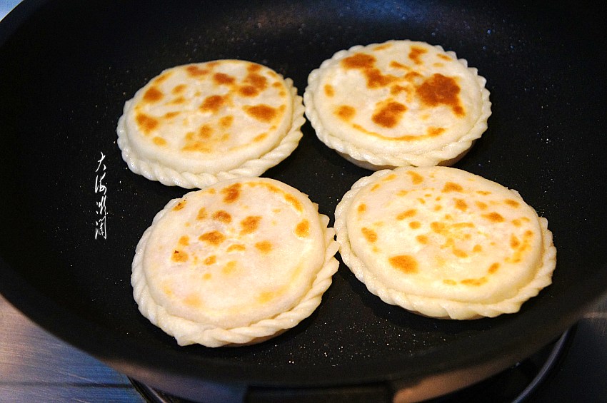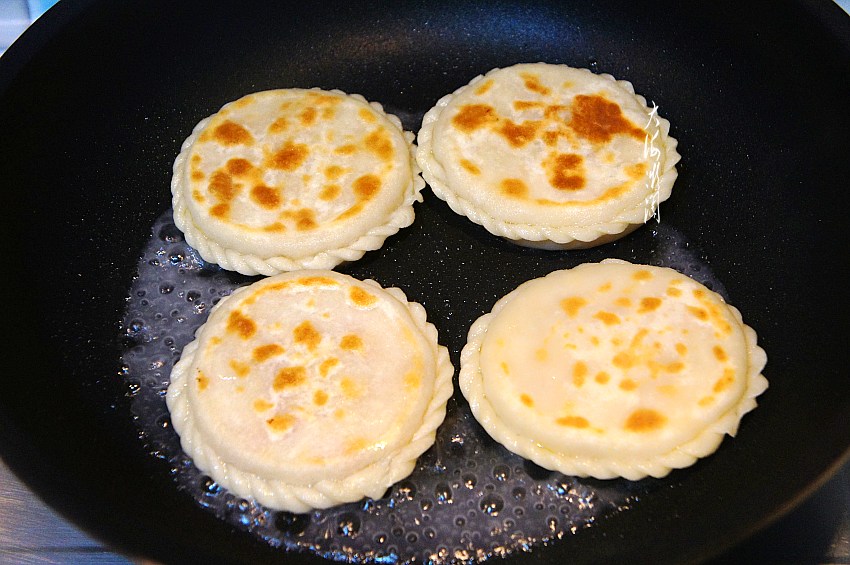 平底锅薄薄地刷油,放入包好的合子,小火烙,一面烙好,翻面烙另一面,待另一面烙好,倒入少许水,盖上锅盖焖至水干,这样皮馅都能熟透。