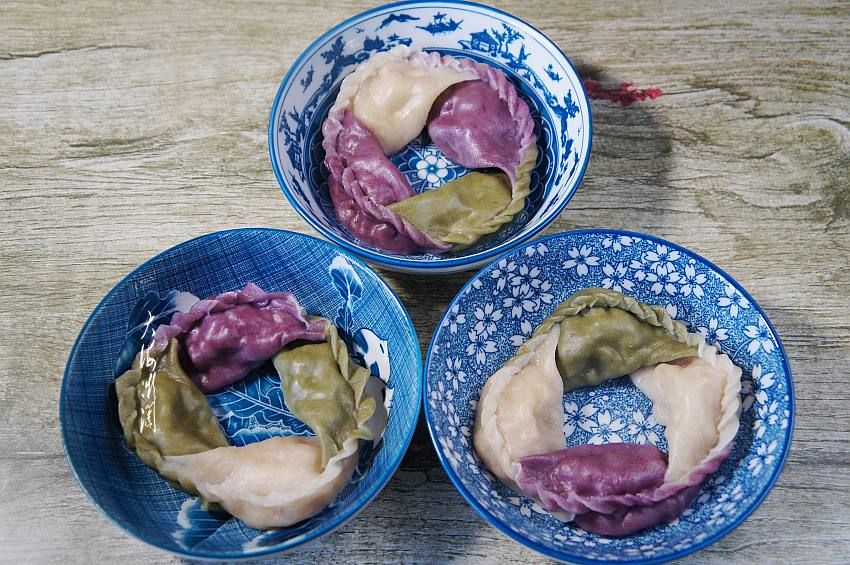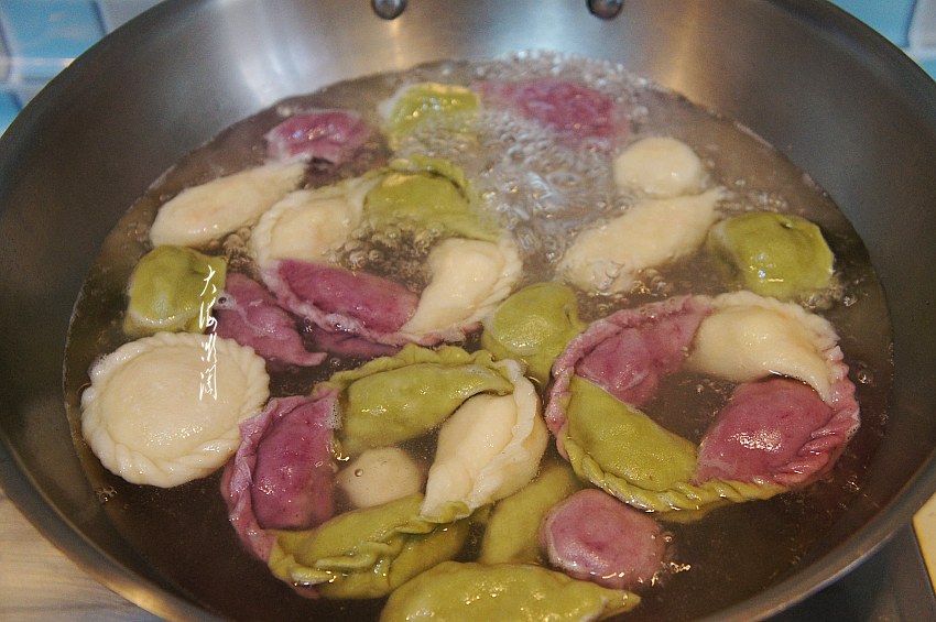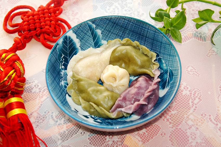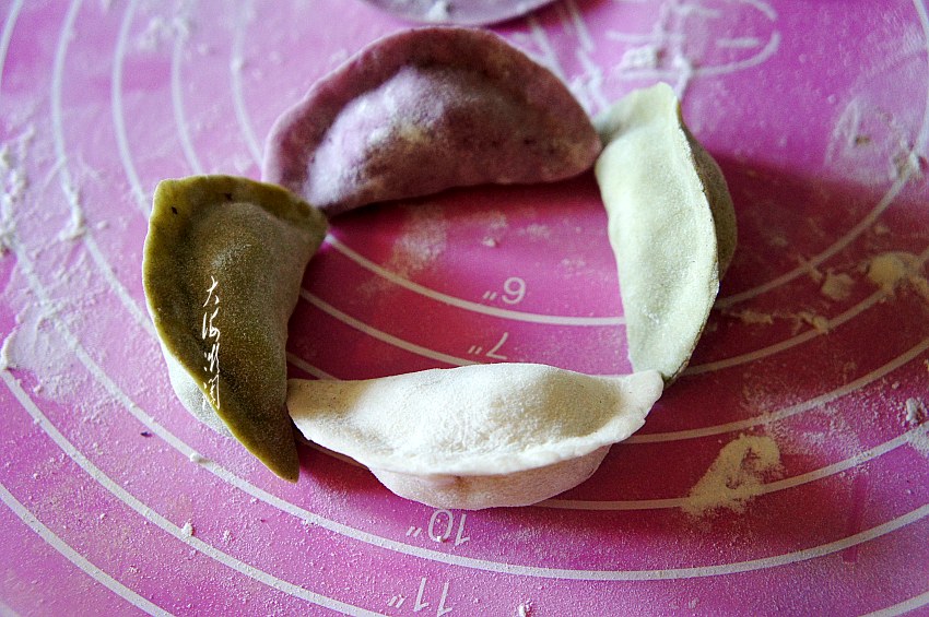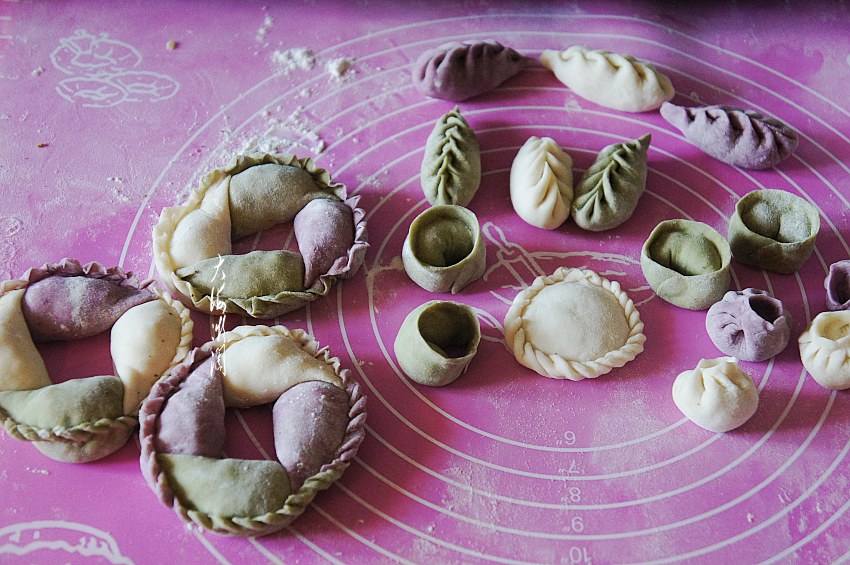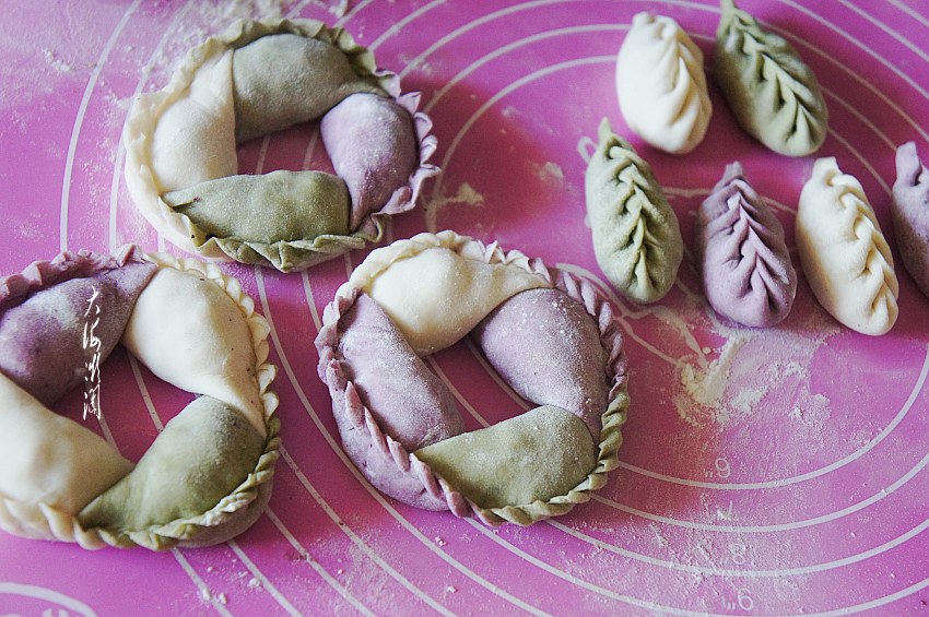 包饺子:花式饺子之铜币饺子包法,3种颜色饧好的面团,分别揉成长条,均匀的分成小面剂子,擀成饼,包上馅,先捏成普通饺子。这个谁都会哈,然后每4个为一组,搭配好颜色,把4个饺子一个压一个捏在一起,然后捏出花边,形状如古铜币,中间有个四角孔,北方过年都要包上几个,寓意财源滚滚,吉祥如意。