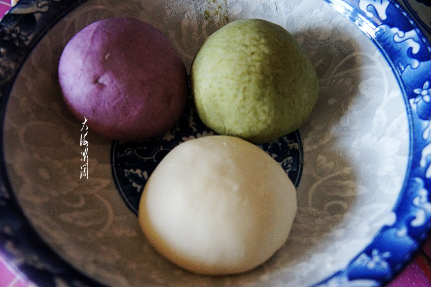 和面:面粉一分为三,一份加紫薯粉、一份加青汁粉、一份什么都不加,每份都加入适量的水揉成面团,盖上保鲜膜饧着。