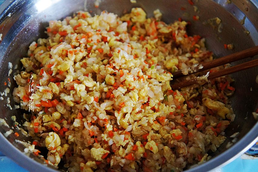 准备馅:白菜谐音百财,正月十五吃白菜馅水饺,祈福百财哈!白菜洗净剁碎,加适量的盐腌制10分钟后,攥掉水分备用,葱去皮洗净剁碎。鸡蛋打散,入油锅煎熟,煎鸡蛋的时候适量多放一点油,拌馅就不用再放油了,用花生油拌馅很香。大葱洗净剁碎,葱可以多放点,提味。胡萝卜去皮洗净擦丝再切碎,所有食材准备好,加入盐、五香粉、蚝油、少许轻盐酱油拌匀。