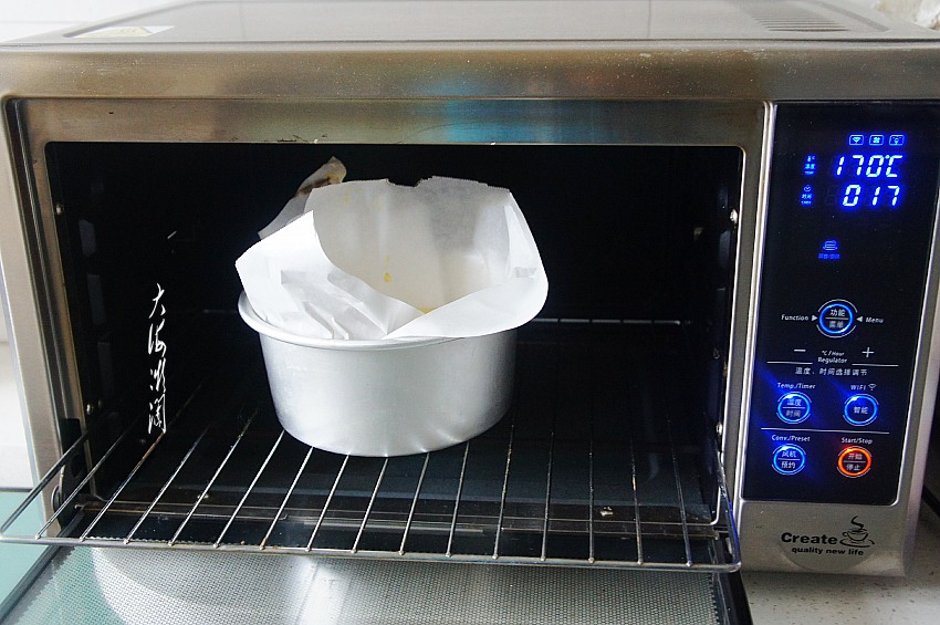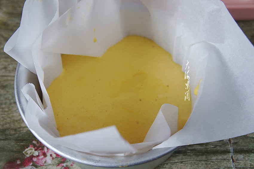 将蛋糕糊倒入到铺好油纸的模具内,我这油纸铺得不够完美哈,可以整理得更好看一些,压得更贴近模具。