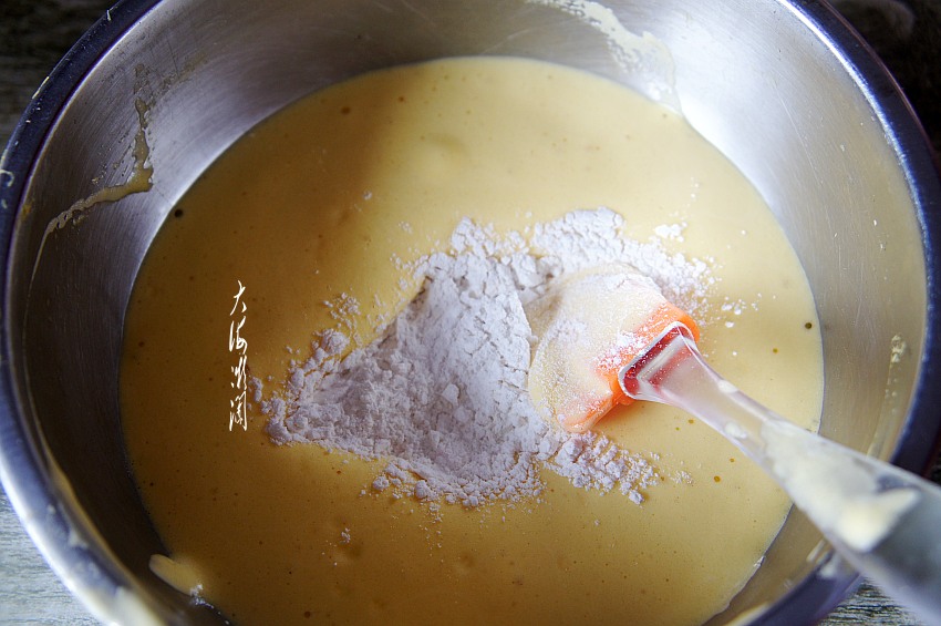 筛入低筋粉,用刮刀上下翻拌均匀至无面粉颗粒。