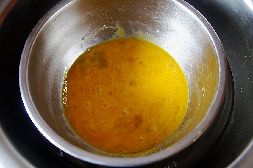 准备更大一点的盆,加入约60度的热水,隔水将盆中的食材用蛋抽子搅拌均匀至糖、蜂蜜融化,水温40度的时候取出蛋盆,用打蛋器高速搅打。
