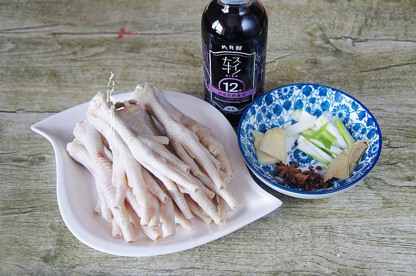 把鸡爪反复清洗两遍,浸泡半小时左右,去除鸡爪中的血水,然后剪掉指甲。葱去皮洗净切段,姜去皮洗净切片,准备一点花椒大料和香叶,用来煮鸡爪。