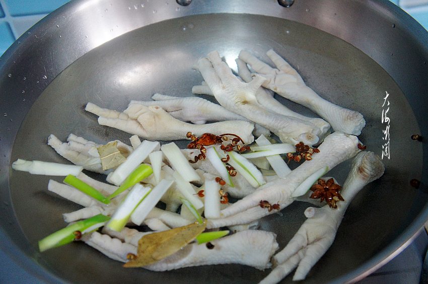 锅中加入适量的水,清洗干净鸡爪冷水入锅,加入少许料酒去腥,下入葱姜和花椒大料香叶,大火烧开,转小火煮半小时左右,捞出放进冷水中过凉,可以煮得略微烂一点好脱骨。