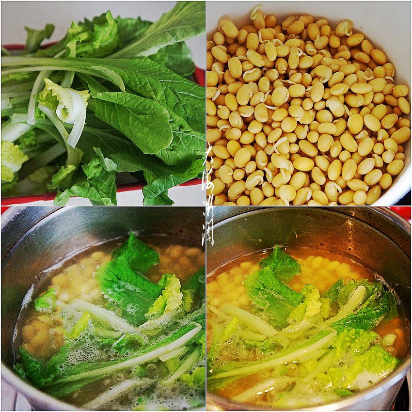 【小白菜黄豆芽汤】食材:黄豆芽适量;小白菜适量;茶籽油少许;盐适量;葱花适量;胡椒粉适量;蘑菇粉适量。