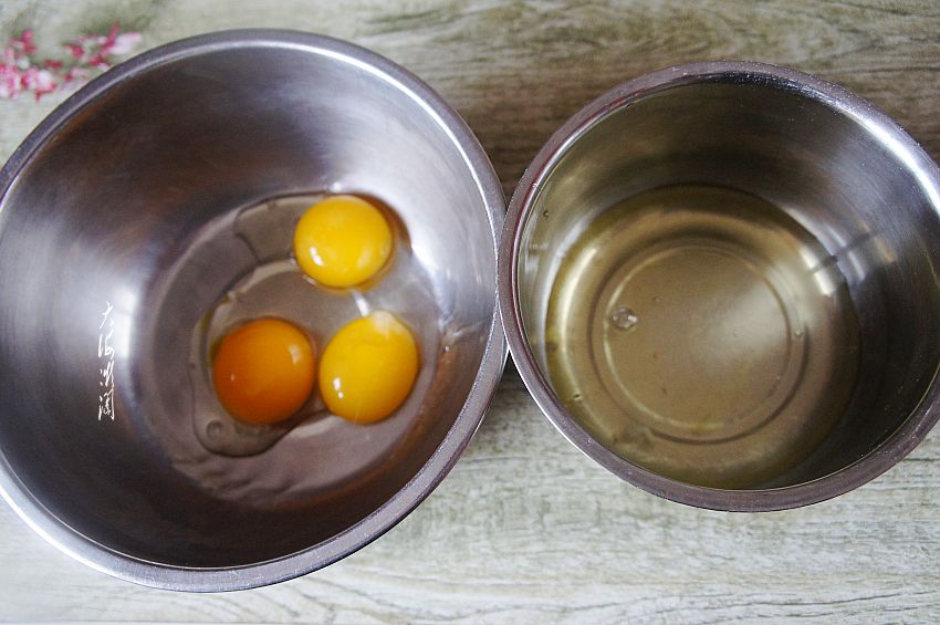 取两个无油无水的盆,把3个鸡蛋蛋白蛋黄分离。