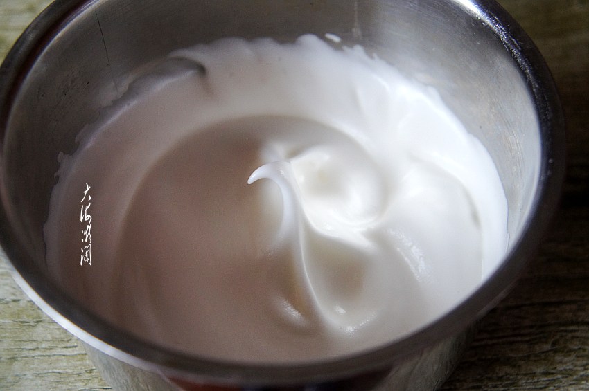 蛋白中加入盐,柠檬汁打发,分三次加入剩余的20g白糖,打发至提起电动打蛋器有两个小尖角不倒就好了。
