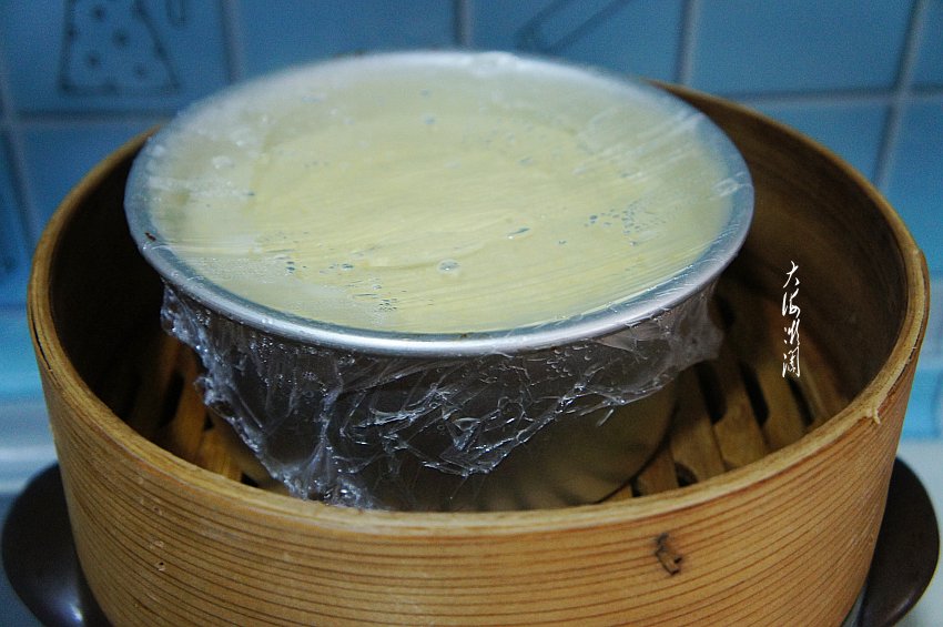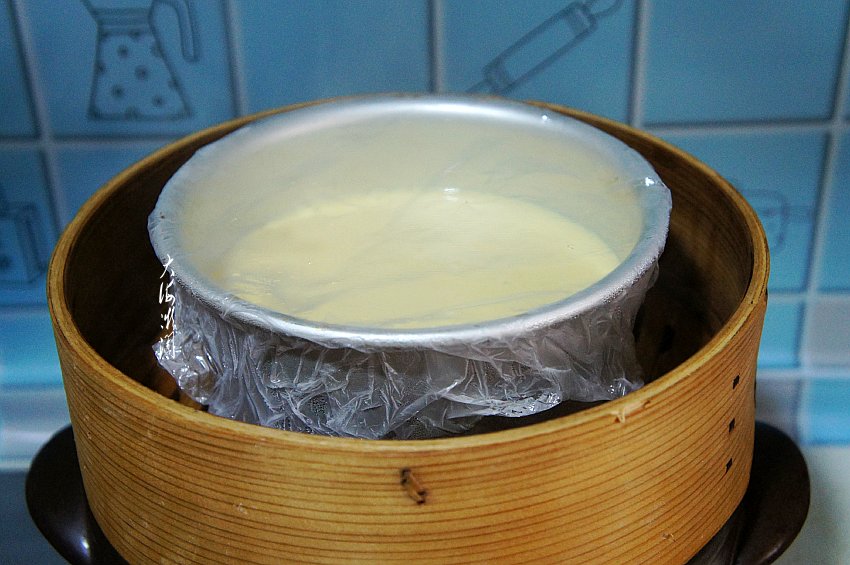 6吋活底蛋糕模具薄薄地刷层油,将切拌好的面糊倒入模具中,轻震一下,或者用牙签在蛋糕糊中来回划几下,去除大气泡。将模具包上保鲜膜,用牙签扎几个小孔透气,水开入蒸屉,大火蒸40分钟。
