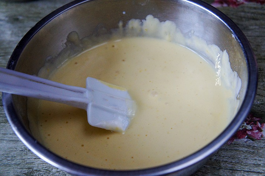 将打发好的蛋白霜分三次加入到蛋黄液中,以“之”字形切拌均匀。切拌蛋糕液的同时,蒸锅中加入适量的水,开火烧水。
