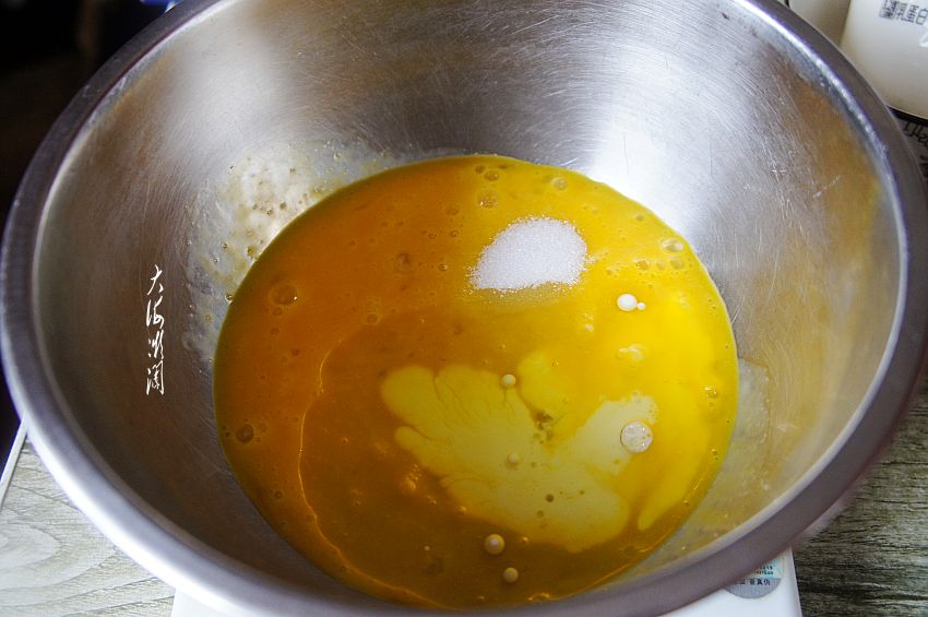 蛋黄中加入20g牛奶、15g橄榄调和油、10g白糖搅拌均匀,充分搅拌至乳化状态。