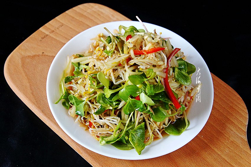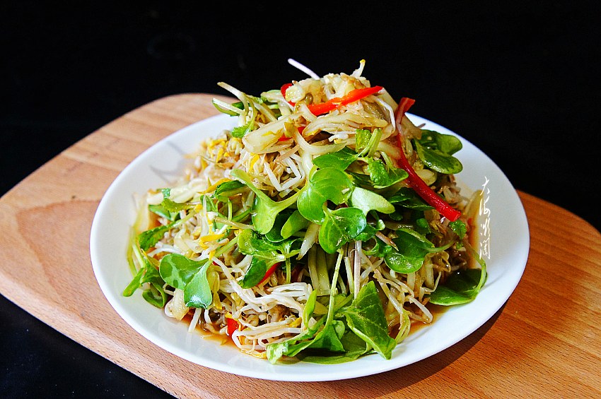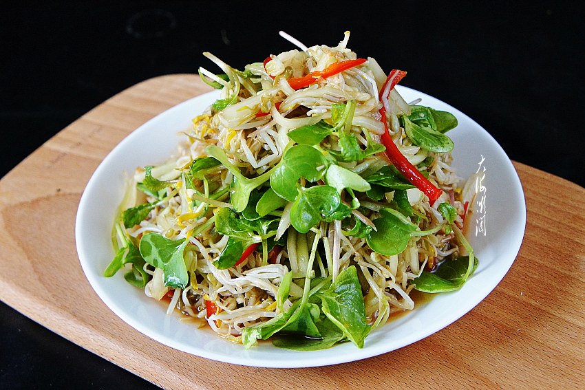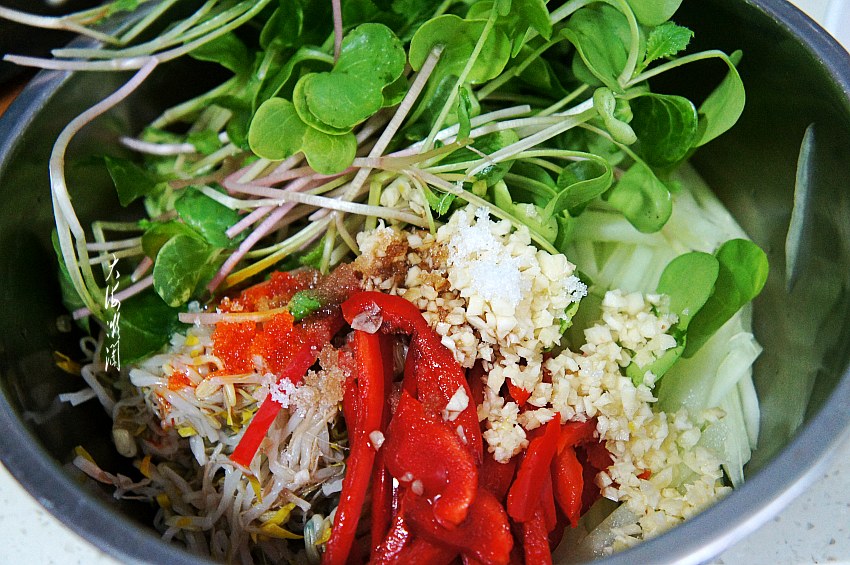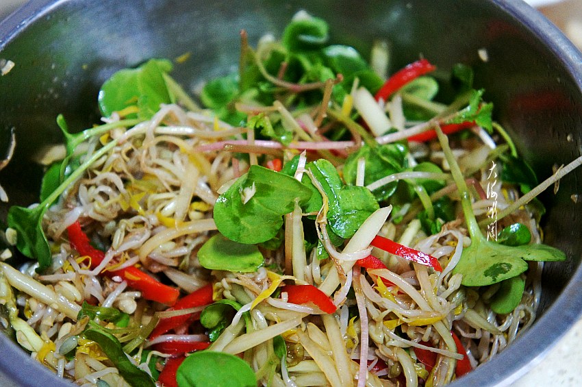 【凉拌和菜】所需食材:绿豆芽1把;水萝卜苗1把;黄瓜1根;盐适量;红椒半个;糖适量;轻盐酱油适量;大蒜适量;辣椒油适量;醋适量。