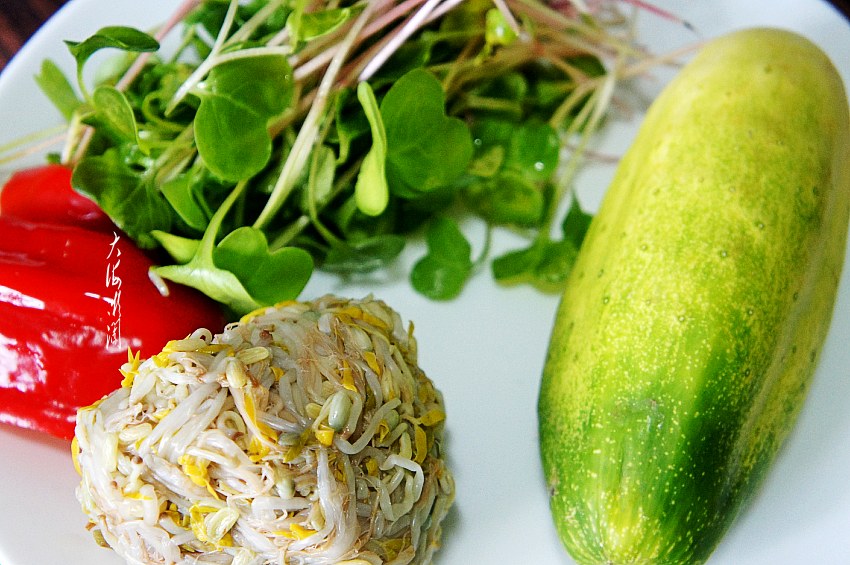 准备食材。绿豆芽提前焯水后,过冷水,然后攥掉水分。萝卜苗清洗干净,注意轻拿轻放轻洗,很脆嫩。黄瓜洗净,不喜欢吃黄瓜皮可以去掉黄瓜皮。