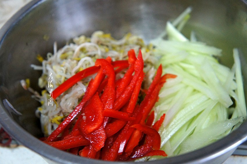 黄瓜去皮洗净切丝,红椒洗净切丝,绿豆芽中间断开。