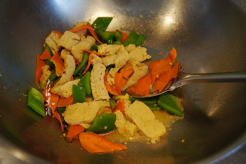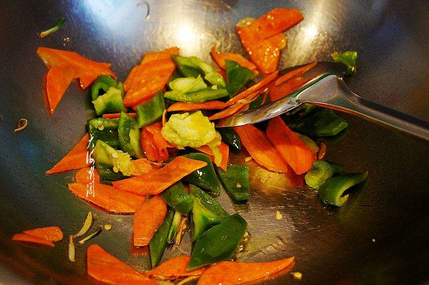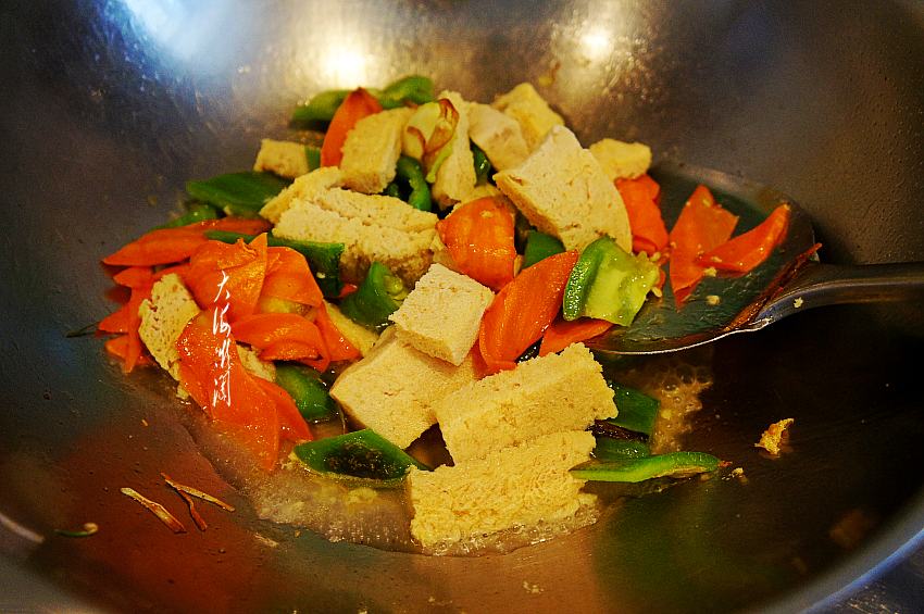 加入冻豆腐翻炒,少许淋点水,让青椒、胡萝卜更脆嫩爽口,颜色更艳丽,冻豆腐更滋润,口感更软绵。