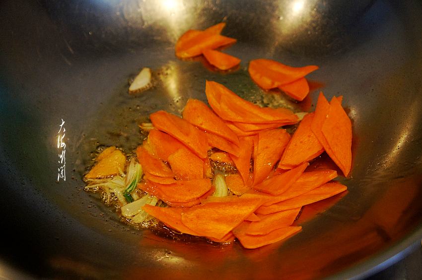 炒锅加入橄榄调和油,爆香五香粉和葱花,下入胡萝卜翻炒。