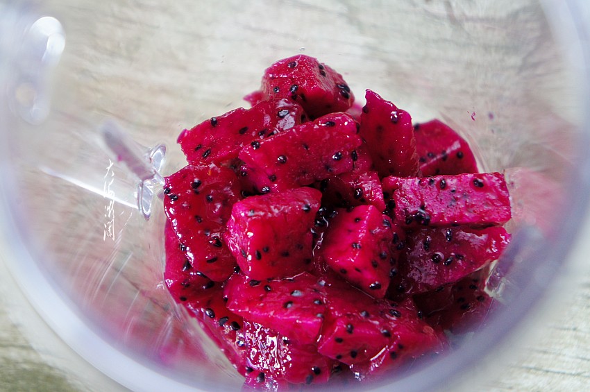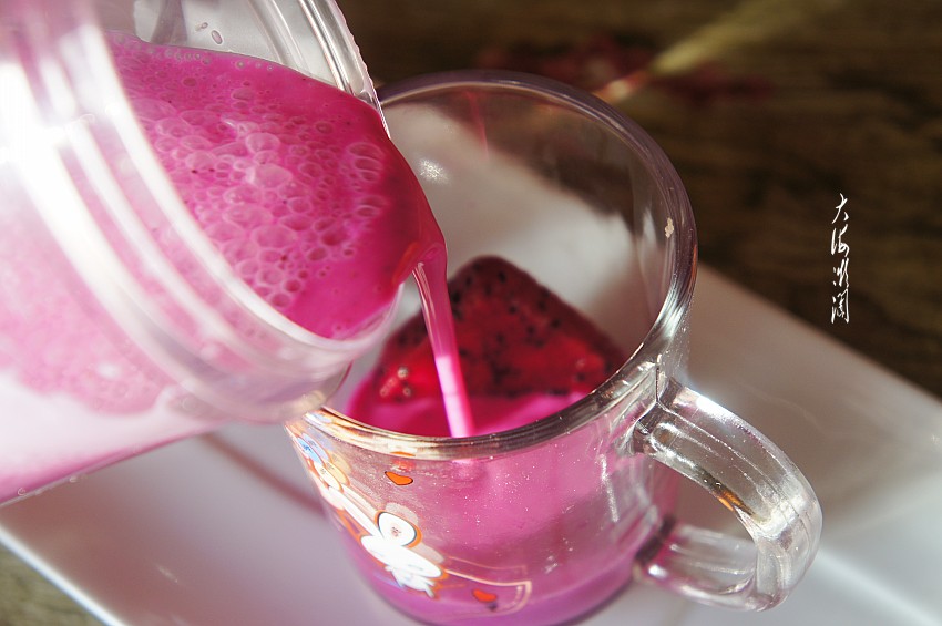 杯中还可以放一些火龙果块,然后倒入火龙果奶昔。