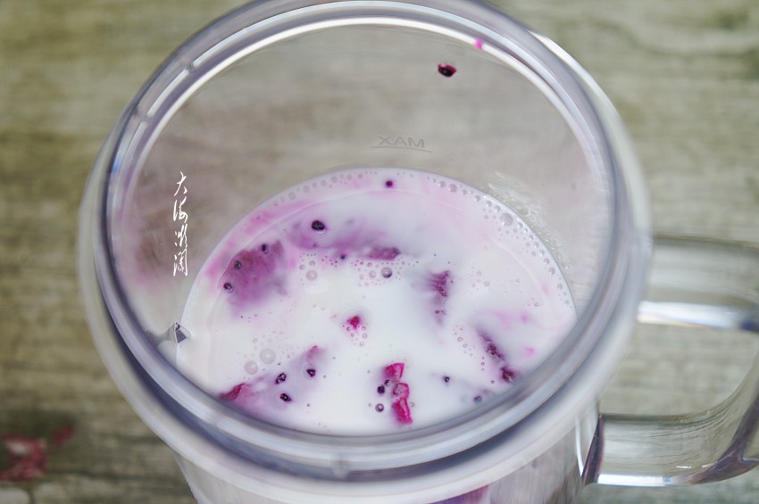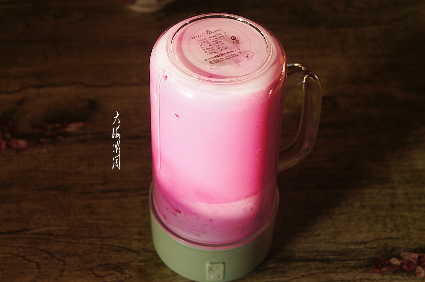 启动开关,料理杯倒置,只需40秒钟,一杯健康的火龙果奶昔就做好了。