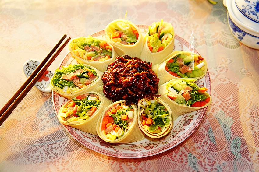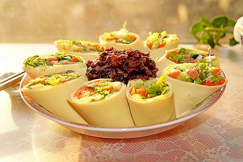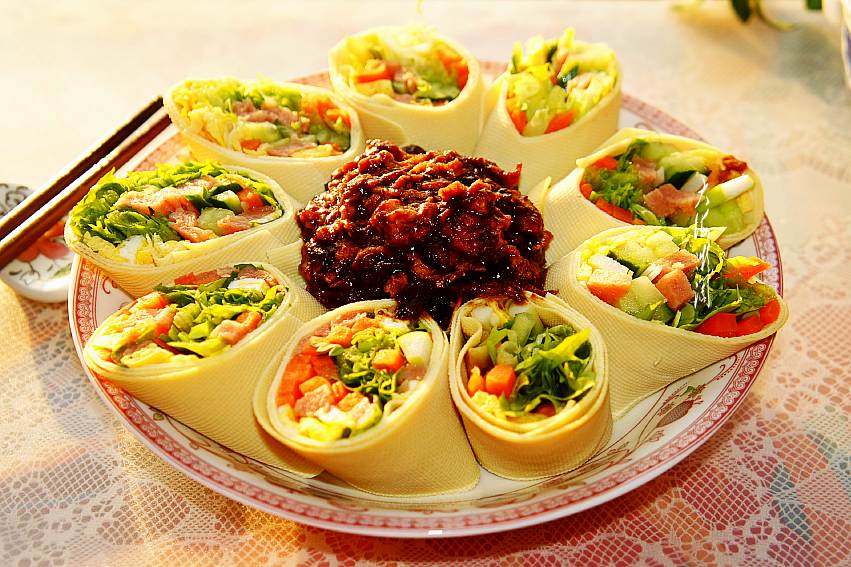 这是一道东北人最爱吃的蘸酱菜,通常人们吃蘸酱菜都会多吃一碗饭,这道蘸酱菜的最大特点是不用吃主食,因为它是用干豆腐把菜卷起来,即是主食也是菜,解馋又顶饱,好吃还不长肉。常言道,早餐要吃好,午餐要吃饱,晚餐要吃少,这菜放到晚,多卷蔬菜,热量低,纤维素多,吃后易产生饱胀感,能帮助胃肠消化,清理肠道垃圾,不用减肥,好吃不胖人,还能排除身体中的毒素。