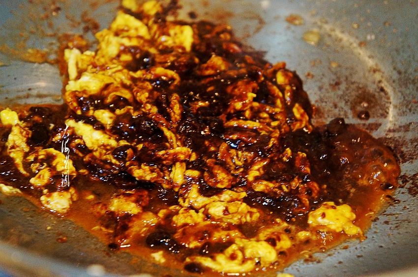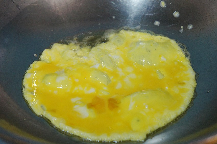 鸡蛋打散,少许兑点水搅拌均匀,炒锅加入适量的油,倒入蛋液搅碎煎熟,鸡蛋尽量碎一点点,然后加入适量的6月香葱伴侣豆瓣酱炸熟。