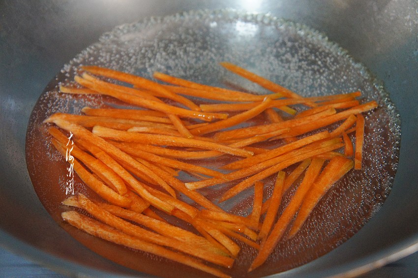 锅中加入适量的水,水开下入胡萝卜丝焯水,胡萝卜丝变软捞出,过冷水控净水分备用。