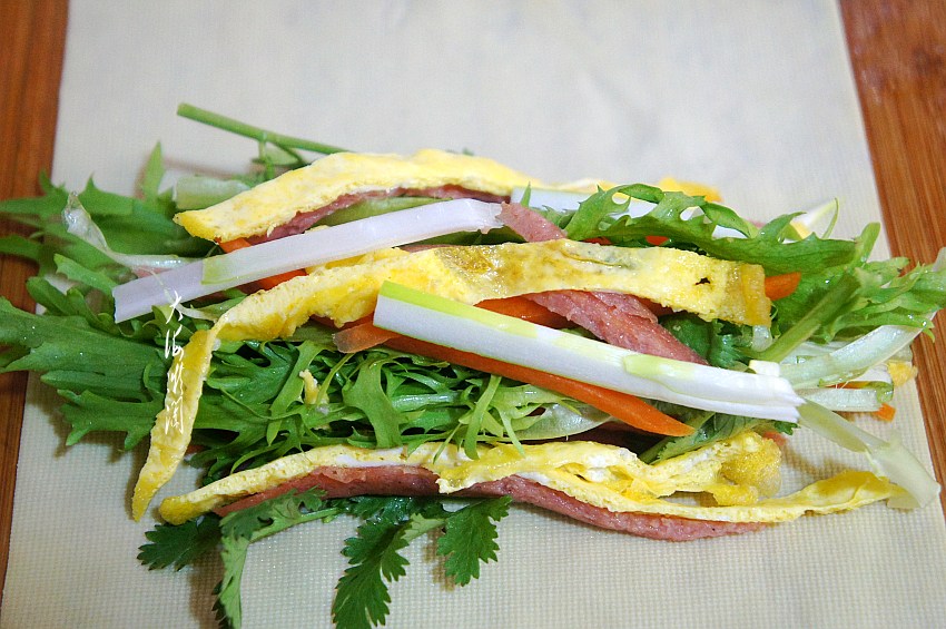 取一张干豆腐,铺开码入黄瓜丝、胡萝卜丝、生菜、苦菊、香菜、大葱,从一头卷起来,注意要卷紧实一些。