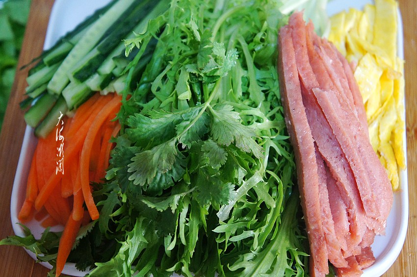 煎好的鸡蛋饼切条,黄瓜切条,生菜切丝,大葱切条,火腿肠切条(晚餐可以省略),所有的食材准备好。