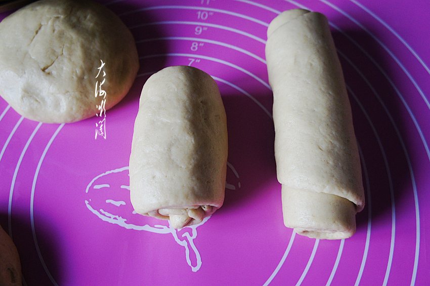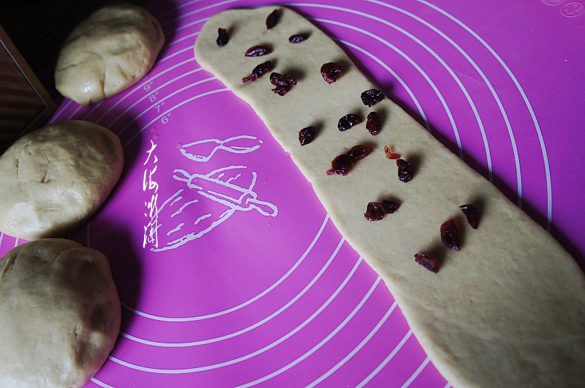 然后按平擀成长条,撒上蔓越莓干,再从一头卷起来。
