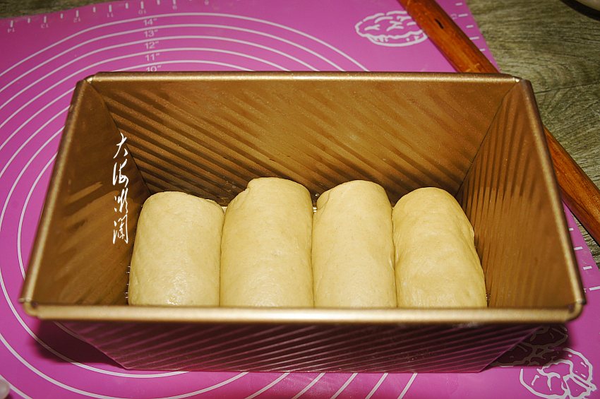 同样的方法卷好另外3个面剂子,然后码入吐司盒。放入烤箱,二次发酵,45度设置发酵时间40分钟即可。