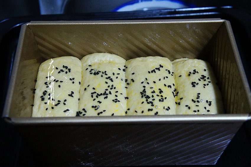 二次发酵完成后取出烤盘,打开吐司盒盖,烤箱先160度预热5分钟,预热期间给发酵好的吐司表面刷层蛋液,再撒点黑芝麻。
