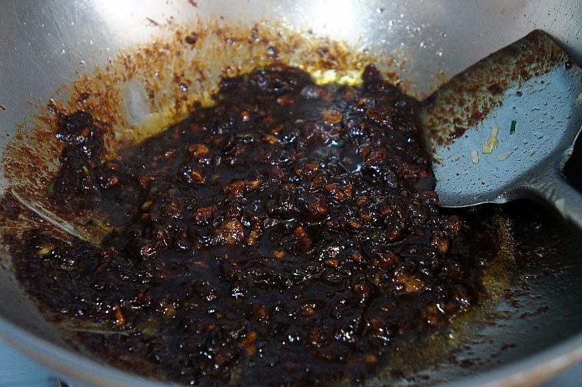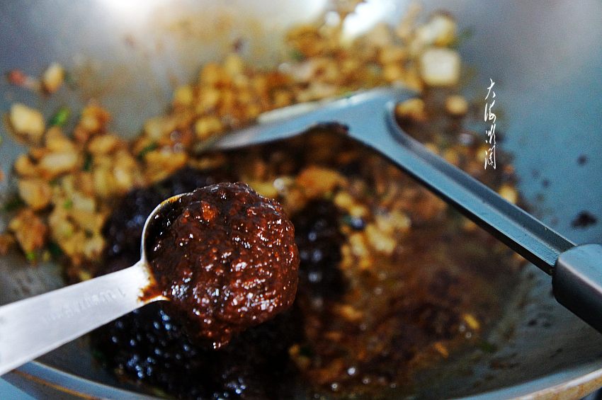 加入适量的六月香豆瓣酱,这酱口感好,鲜甜咸香,炸肉酱做凉拌菜或者炸酱面都特别好吃,蘸拌焖炒一勺搞定,简单味美。