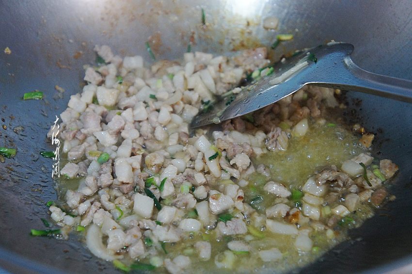 炒锅加入适量的油,爆香五香粉和葱花,下入肉丁翻炒,少许淋点水,让肉质更鲜嫩,同时还能把肥肉中的油炒出来,然后烹入少许料酒和生抽翻炒入味。