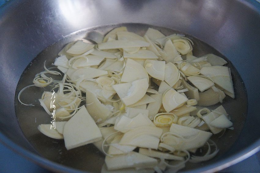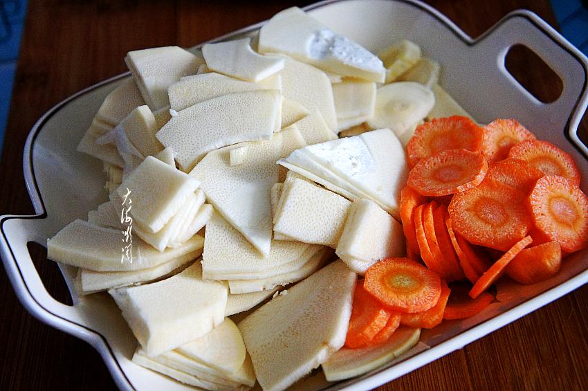 冬笋和胡萝卜分别切片,薄厚大小都随意。吃冬笋时一定要注意,因为冬笋含有草酸,容易和钙结合成草酸钙,所以吃前一定要拿淡盐水煮5-10分钟,去除大部分草酸和涩味。