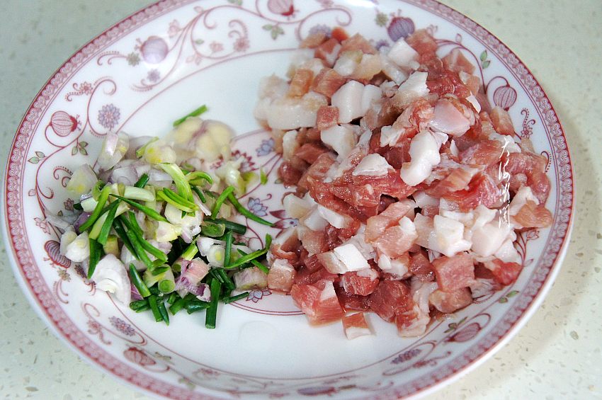 猪肉洗净切丁,有肥有瘦才香,也可以全部用瘦肉,葱去皮洗净切碎。