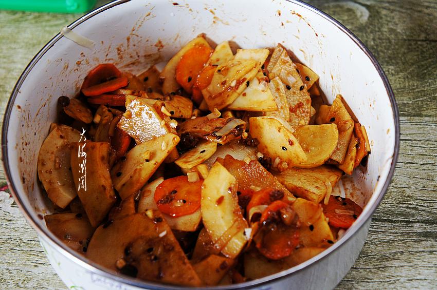 取大一点的容器,加入冬笋片和胡萝卜片,加入蒜碎、少许熟黑芝麻,喜欢辣味的可以加点辣椒油或者加点小米辣,然后加入适量的肉酱一拌,太好吃了,一大盘也是瞬间就秒光了。