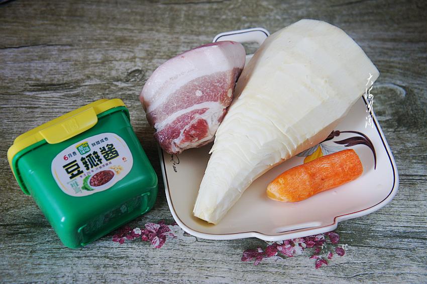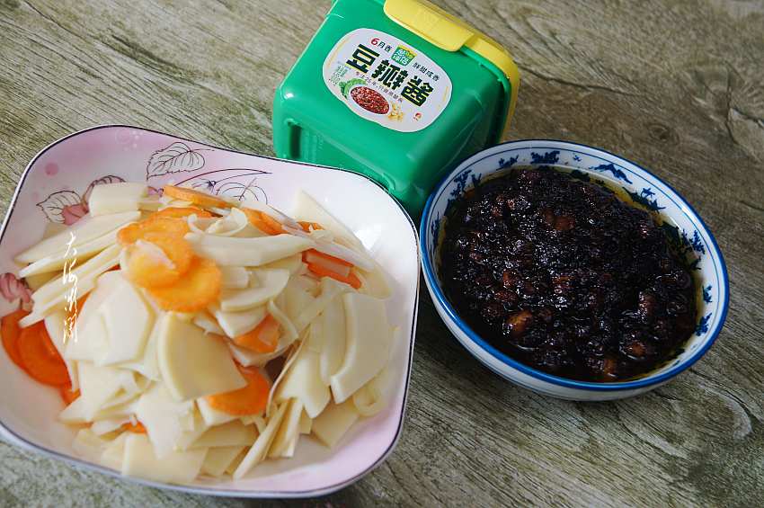 【肉酱拌冬笋】所需食材:冬笋半个;胡萝卜1根;猪肉适量;橄榄调和油适量;葱蒜适量;料酒少许,生抽少许;五香粉适量;六月香豆瓣酱适量。